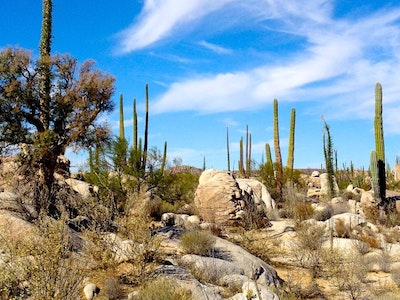 When you head east to the Sea of Cortez, the land turns into semi-desert with hot summers and warm winters.