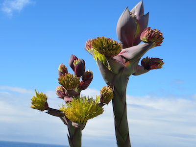 Agaves are plants superbly adapted to the climate – collecting humidity from the morning fog and letting almost no water evaporate from their leaves. After some years, a tall flower stalk grows out of the plant’s center, which attracts the local populations of hummingbirds and bees.