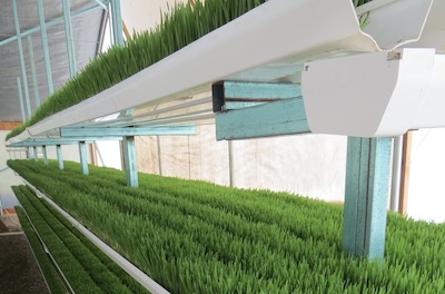 Some of these wheat grains are used to produce “wheatgrass”, sprouted grains that are rich in proteins. The wheatgrass production takes place in the greenhouse in a set of “gutters” kept humid by trickles of water. The grains sprout quickly and form a “mat” that can be harvested after 8 days and fed to the dairy cattle.